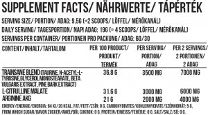 Zutaten: L-Citrullin Malat, Arginin AKG, Taurin, N-Acetyl-L-Tyrosin, Glycerol Monostearat, Beta Vulgaris Extrakt, Pine Bark Extrakt, Aromen, Chinolingelb, Äpfelsäure, Sucralose, Silik