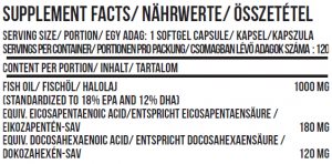 ZUTATEN: FISHÖL (STANDARDISIERT ZU 18% EPA UND 12% DHA), KAPSELN (GELATINE), FEUCHTHALTEMITTEL (GLYCEROL), GEREINIGTES WASSER, ANTIOXIDANS (DL-ALPHA-TOCOPHEROL).